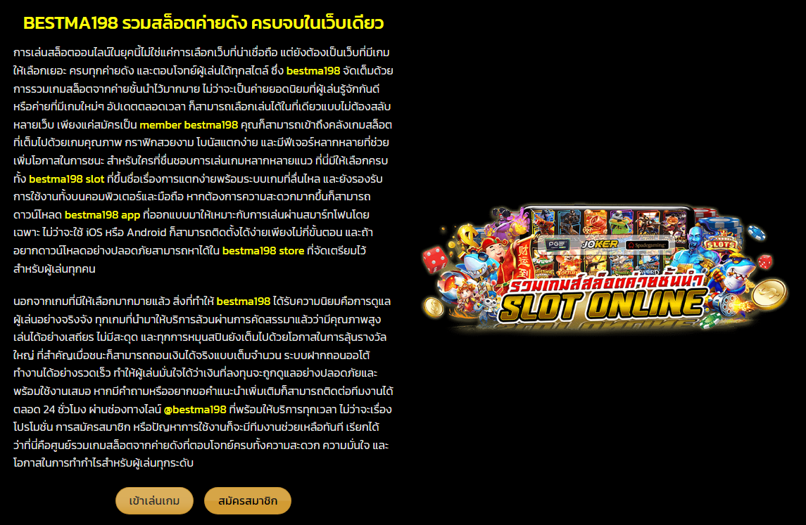 เว็บเดิมพันที่ครบจบทุกบริการในที่เดียว bestma198 ครบจบในเว็บเดียว เว็บตรงพนันลิขสิทธิ์แท้จากต่างประเทศ ที่รวมทั้งสล็อต คาสิโนสด บาคาร่า หวยสด บอลออนไลน์ ระบบเว็บลื่นไหล ใช้งานง่าย รองรับทุกอุปกรณ์ ทั้งมือถือและแท็บเล็ต ฝากถอนด้วยระบบออโต้แท้ ไม่ต้องแจ้งสลิป ไม่ต้องโยกเงินให้ยุ่งยาก เล่นได้ทุกค่าย ถอนเงินได้ทุกยอดแบบไม่มีขั้นต่ำ bestma198 พร้อมโปรโมชั่นต้อนรับสุดคุ้ม ฝาก 50 รับ 100 ไม่ต้องทำเทิร์น แจกจริงทุกยูส ไม่มีอั้น
